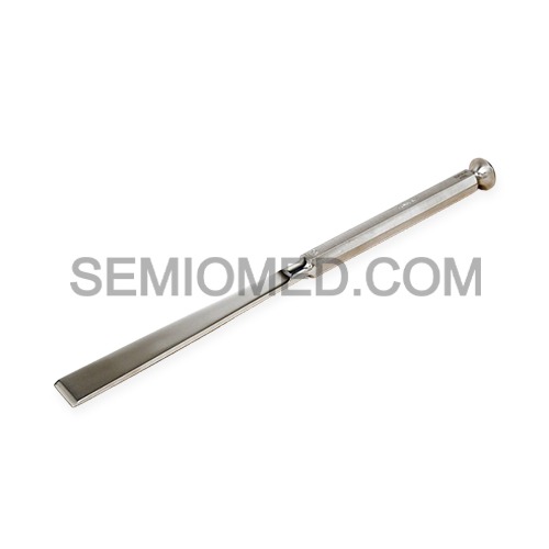 - Manche solide avec une surface inférieure circulaire, qui reçoit l’impact du maillet pour pousser le ciseau contre l’os.